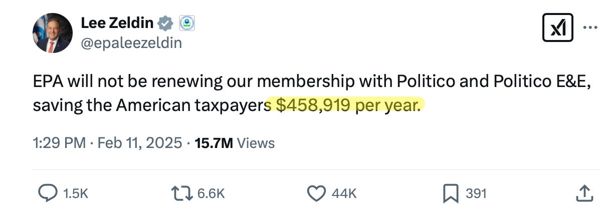 In a story unsurprisingly not covered yesterday in corporate media, newly confirmed EPA head Lee Zeldin announced on X that he was canceling the agency’s obscenely expensive Politico subscriptions: