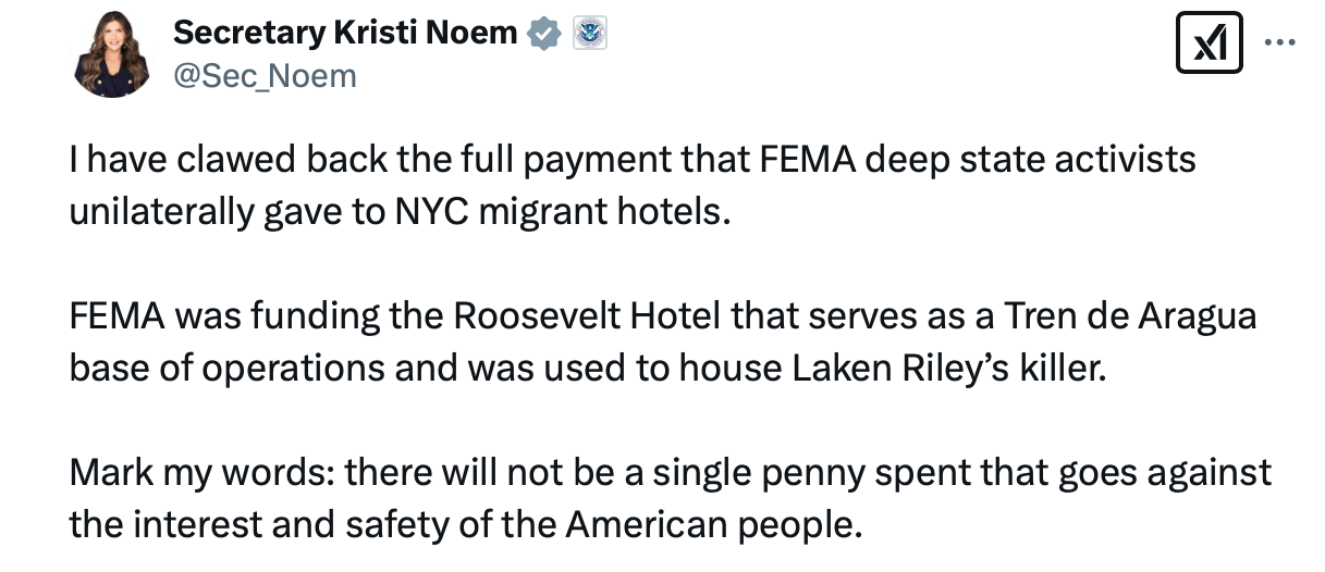 The federal government is being introduced to a shocking new concept called accountability. The Associated Press ran a terrific story yesterday headlined, “4 FEMA employees are fired over payments to reimburse New York City for hotel costs for migrants.” The headline referred to the $59 million payment sent to luxury New York City hotels to provide long-term migrant housing at double rates and 100% occupancy— for free to the illegal migrants!— even while LA County and North Carolina citizens are still living in tents. And it violated Trump’s direct order to suspend those very payments.