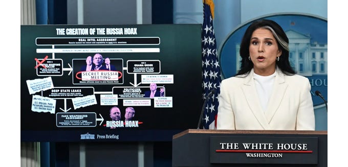 That’s why the Times story was so awful. The whole narrative revolved around how, from the Times’ assessment, she provided no evidence. But Tulsi Gabbard doesn’t owe the New York Times an evidentiary packet. She isn’t litigating a case before Judge Maggie Haberman. She’s sounding an alarm from inside the machine.