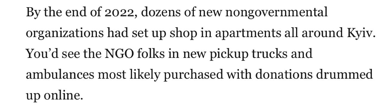 The op-ed was intended to reinforce the official narrative of Routh as an unstable Ukraine fetishist and a failure, and to provide some stuffing for the official story about Routh’s Ukraine activism. But we did learn a few new things. According to the author, who was there, as soon as the war started, new NGO’s began sprouting in Ukraine like spring wildflowers: