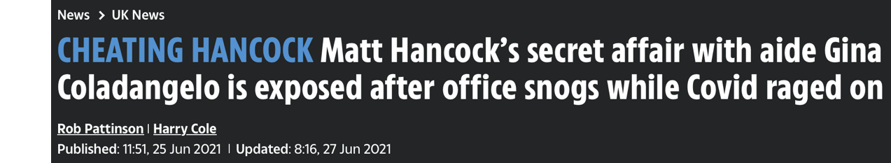 Or, how about Britain’s mandate architect and Health Sex-retary Matt Hancock, also caught cheating, also during lockdowns. UK Sun, June 2021:
