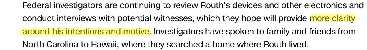 Unsurprisingly, according to CNN’s sources, Routh is “not cooperating.” But think about that. Not cooperating doesn’t sound very crazy, does it? A crazy ideologue would be talking a blue streak. Not cooperating is smart. It requires discipline, since the feds on scene are probably trying pretty hard to talk him into cooperating.