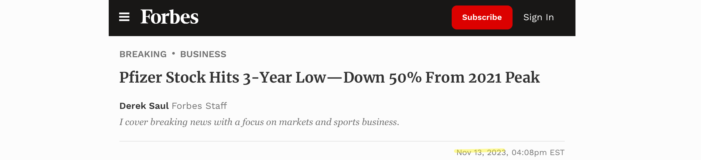I’m not saying the hearing was the reason, though it couldn’t have helped any, that Pfizer’s stock is down again, now at its lowest price since December 2016. Behold Monday’s headline: