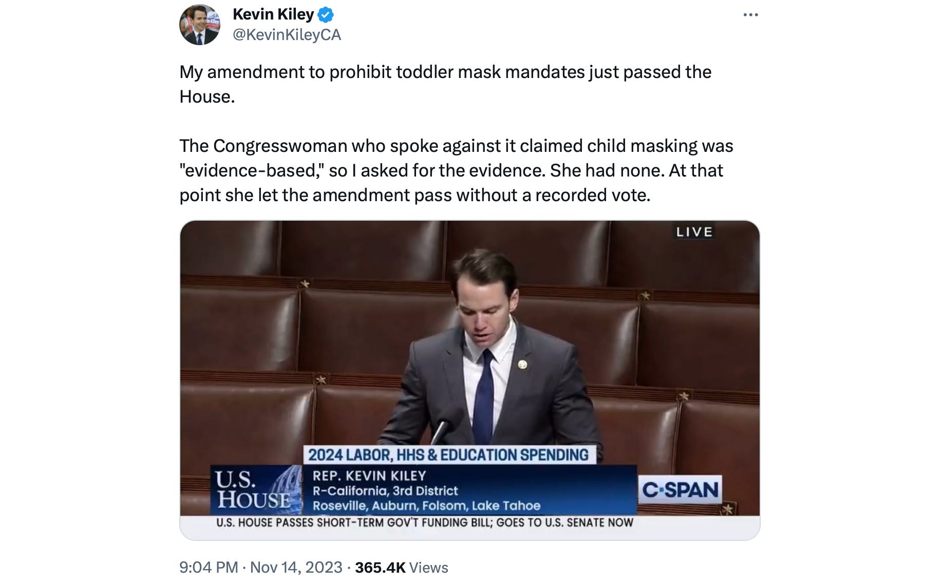 😷 Yesterday, Representative Kevin Kiley (R-Ca.) successfully passed an amendment that would ban toddler mask mandates in federal programs like Head Start.