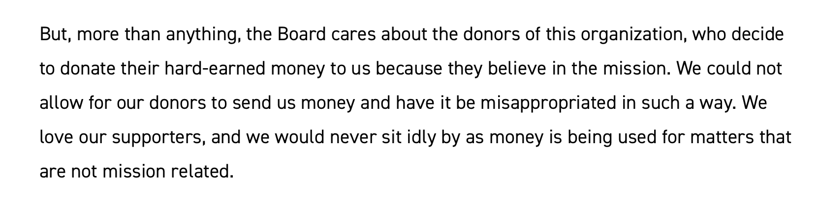If this was legit, the board would NOT be sending one-sentence emails without any details or plans about how they’re going to handle the massive tsunami of bad PR racing toward the company RIGHT NOW. How about telling staff how much money is in the war chest to see this thing through? How about explaining what the public relations team is up to, or the social media group? How about reporting on how donors are responding to the breaking news and what’s being said to them?