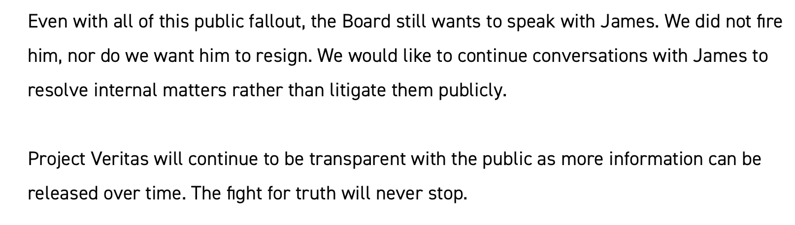 That’s right, I’m calling the Board a collective liar. I won’t name the person I spoke with at Project Veritas, because as far as I know she was just repeating what she was told. But I asked her directly and repeatedly: has there been ANY change to O’Keefe’s title, compensation, or employment status? She directly and repeatedly insisted: NO. No change of any kind, just a couple weeks of PTO.