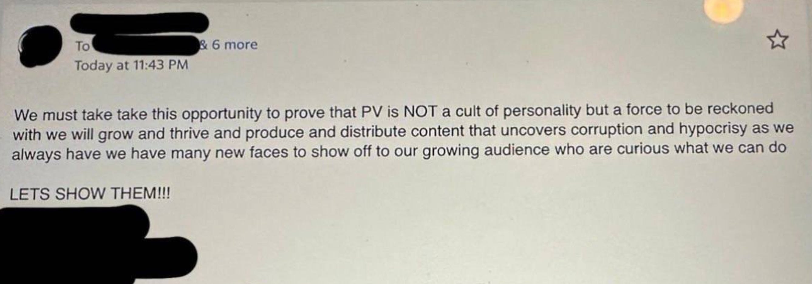 This next email to PV employees from a Board member, leaked last night, is a perfect example. This is supposed to look like damage control — but it’s not. This is a pathetic, barely-trying effort to SIMULATE damage control. If PV were REALLY trying to survive this disaster, the Board would be holding nonstop, in-person, all-hands town hall meetings right now.