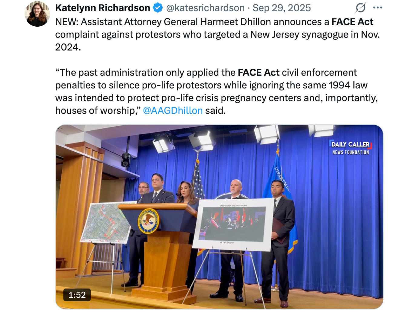 You might recall the FACE Act. Biden’s DOJ deployed it against peaceful protestors at abortion clinics. Contrary to Keith Ellison’s ignorant claims to the contrary, the statute explicitly protects places of religious worship, including churches, from certain kinds of interference. Under 18 U.S.C. § 248, it is a federal crime for anyone, “by force or threat of force or by physical obstruction,” to intentionally injure, intimidate, or interfere with (or attempt to do so) any person “lawfully exercising or seeking to exercise the First Amendment right of religious freedom at a place of religious worship.”