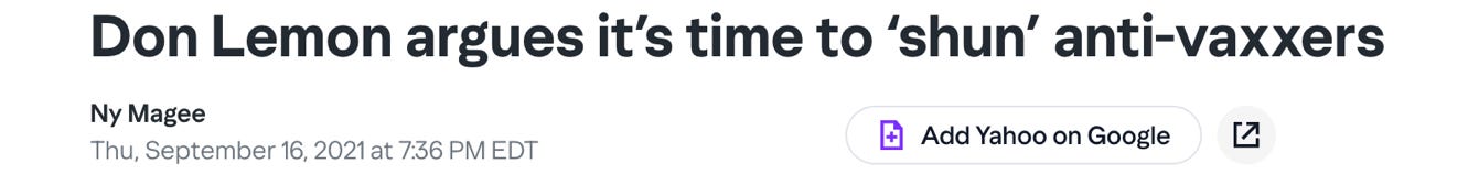 At one time, Don Lemon was woke journalism’s golden boy. Diversely intersectional —he is both black and gay— newcomer Lemon got his own CNN show in 2006. By the time the pandemic began, he was ensconced at the highest levels of salary and benefits at the network, making millions every year under his lucrative media contract. But then Lemon began savaging unvaccinated Americans. Yahoo News, September, 2021: