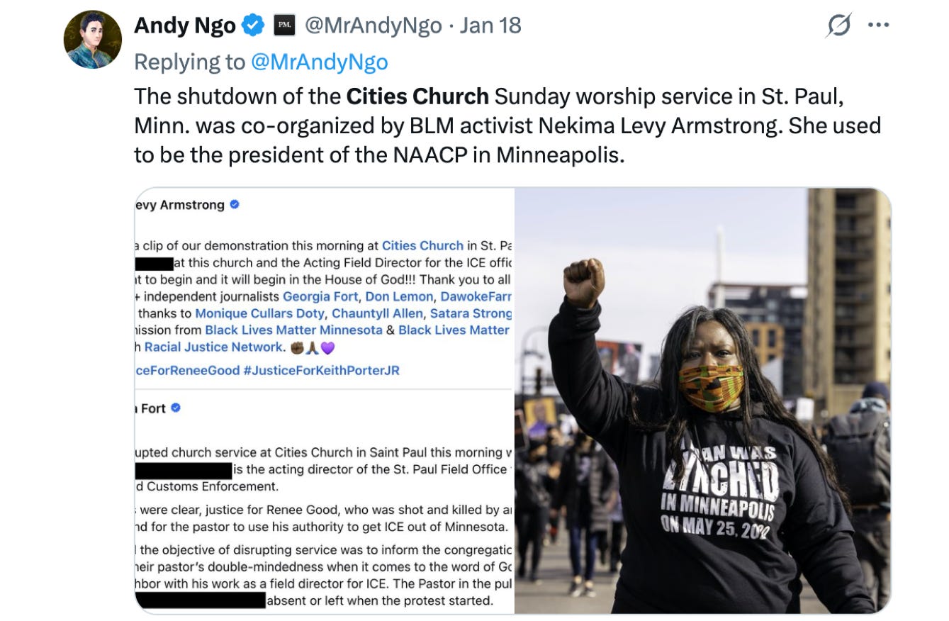 Having obtained a name, two groups of local Black Lives Matter activists hunted Easterwood down, ultimately discovering he is some kind of assistant pastor at Cities Church in St. Paul. So Lemon and the BLM activists plotted to teach the church a lesson, for including an ICE employee in its pastoral staff. (No wonder ICE agents prefer wearing masks and not filing affidavits.)