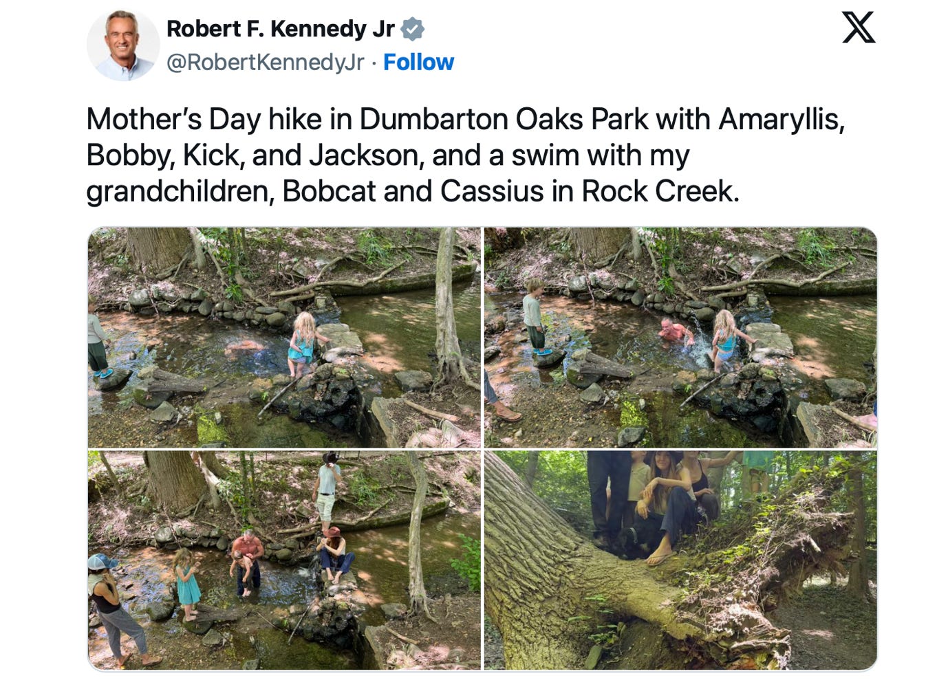 Germaphobic Times reporters went into full Hazmat-mode on Sunday, after Kennedy posted a few innocent pictures of himself stepping through Rock Creek with his grandkids tree-climbing nearby. Instead of running a wholesome headline like, “HHS Secretary Pauses Bureaucracy to Celebrate Mother’s Day,” the Times dove headfirst into municipal water reports. Apparently, Rock Creek has a swimming advisory due to elevated E. coli levels.